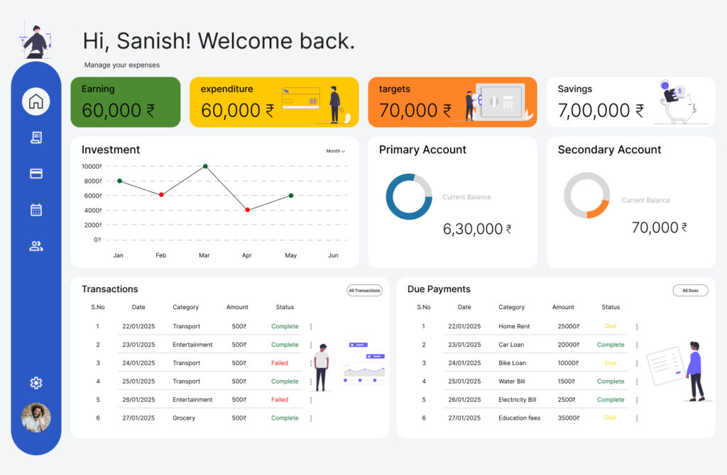 This dashboard design focuses on simplifying personal financial management through a structured and intuitive layout. The top-level cards provide instant insights into earnings, expenditures, targets, and savings. Users can analyze their investment trends through a monthly graph, while account balance widgets offer clear visibility of primary and secondary accounts.